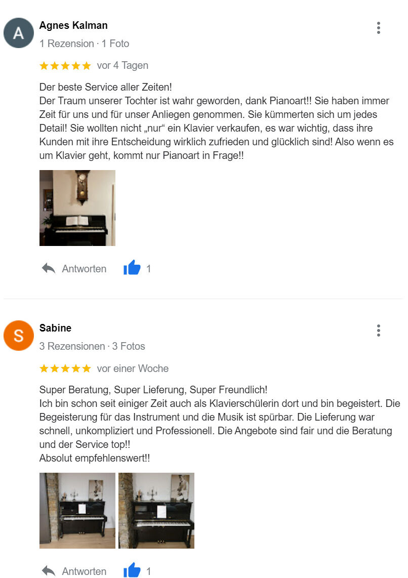 Ich bin schon seit einiger Zeit auch als Klavierschülerin dort und bin begeistert. Die Begeisterung für das Instrument und die Musik ist spürbar. Die Lieferung war schnell, unkompliziert und Professionell. Die Angebote sind fair und die Beratung und der Service top!!